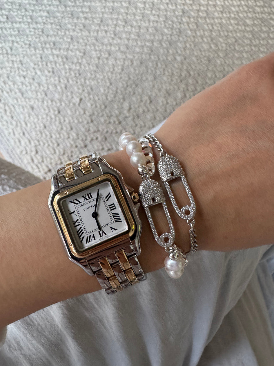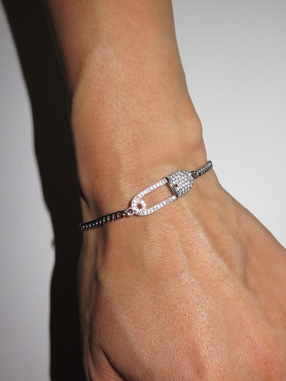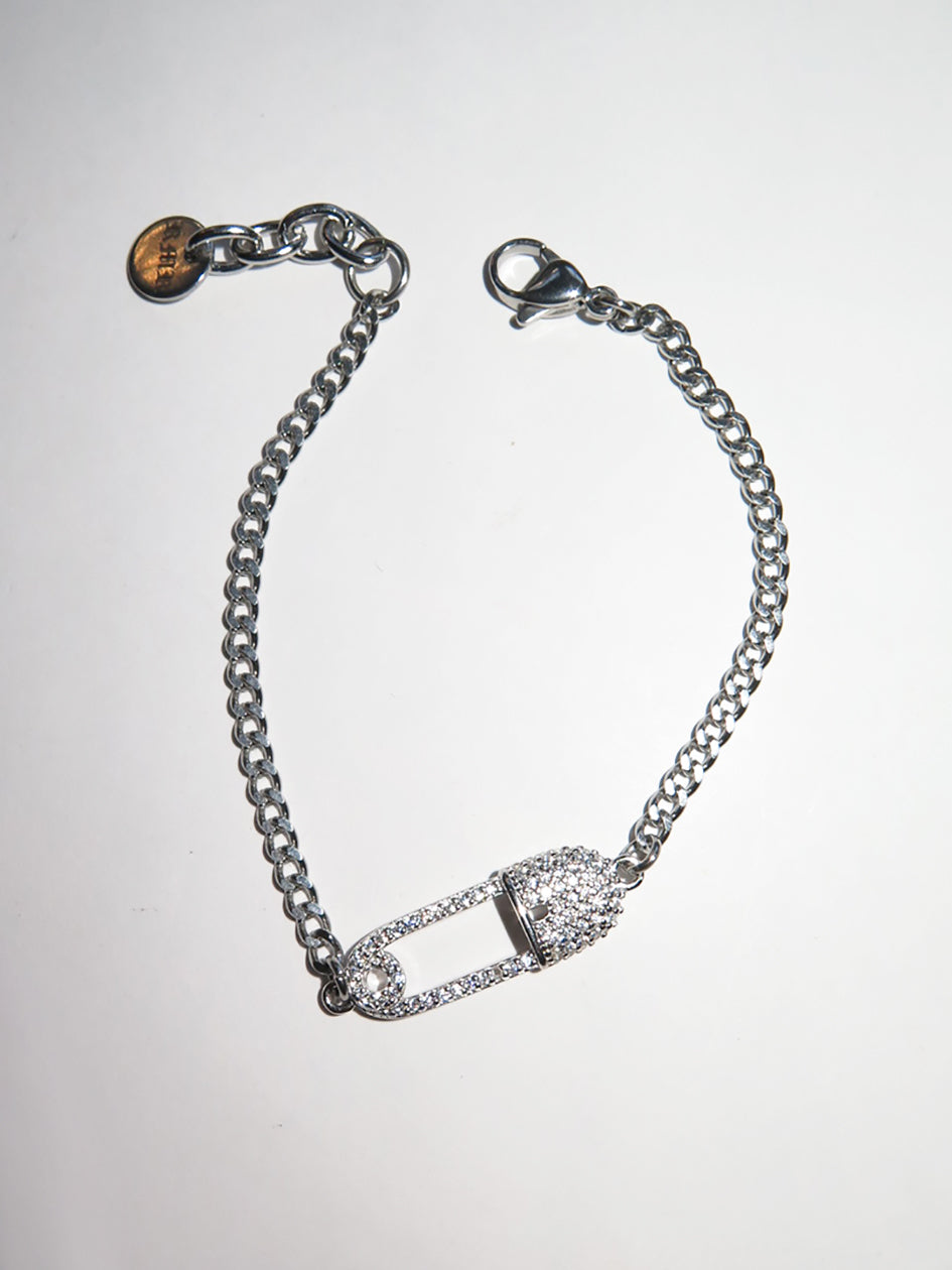 THE ICED SAFETY PIN BRACELET features a 925 sterling silver safety pin covered in cubic zirconia. Complete the look by pairing it with THE ICED SAFETY PIN CHAIN