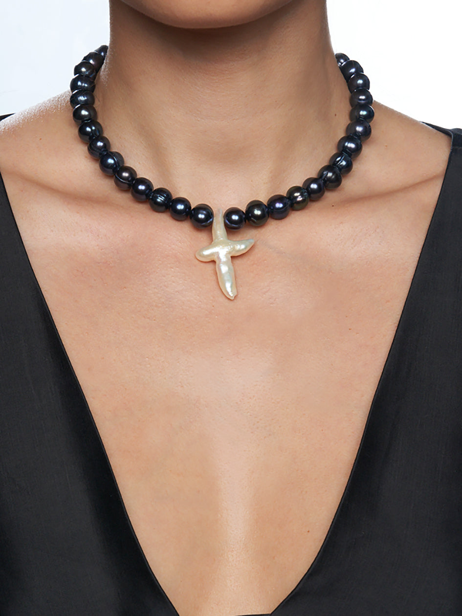 THE BLACK PEARL GEMMA CROSS CHOKER features stunning iridescent black pearls, punctuated with a large white freshwater pearl cross pendant. This one-of-a-kind piece will elevate all your looks. Wear it to update a simple tee look or to complete a night fit!