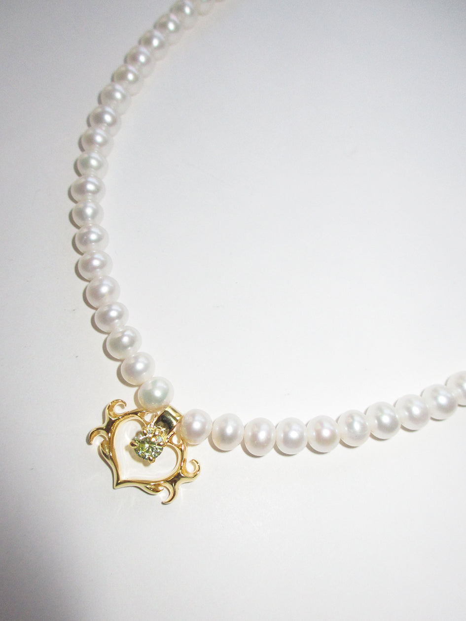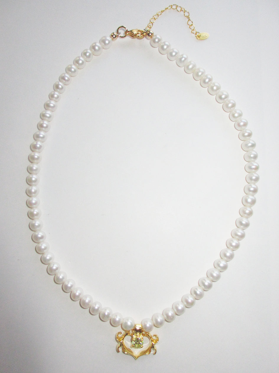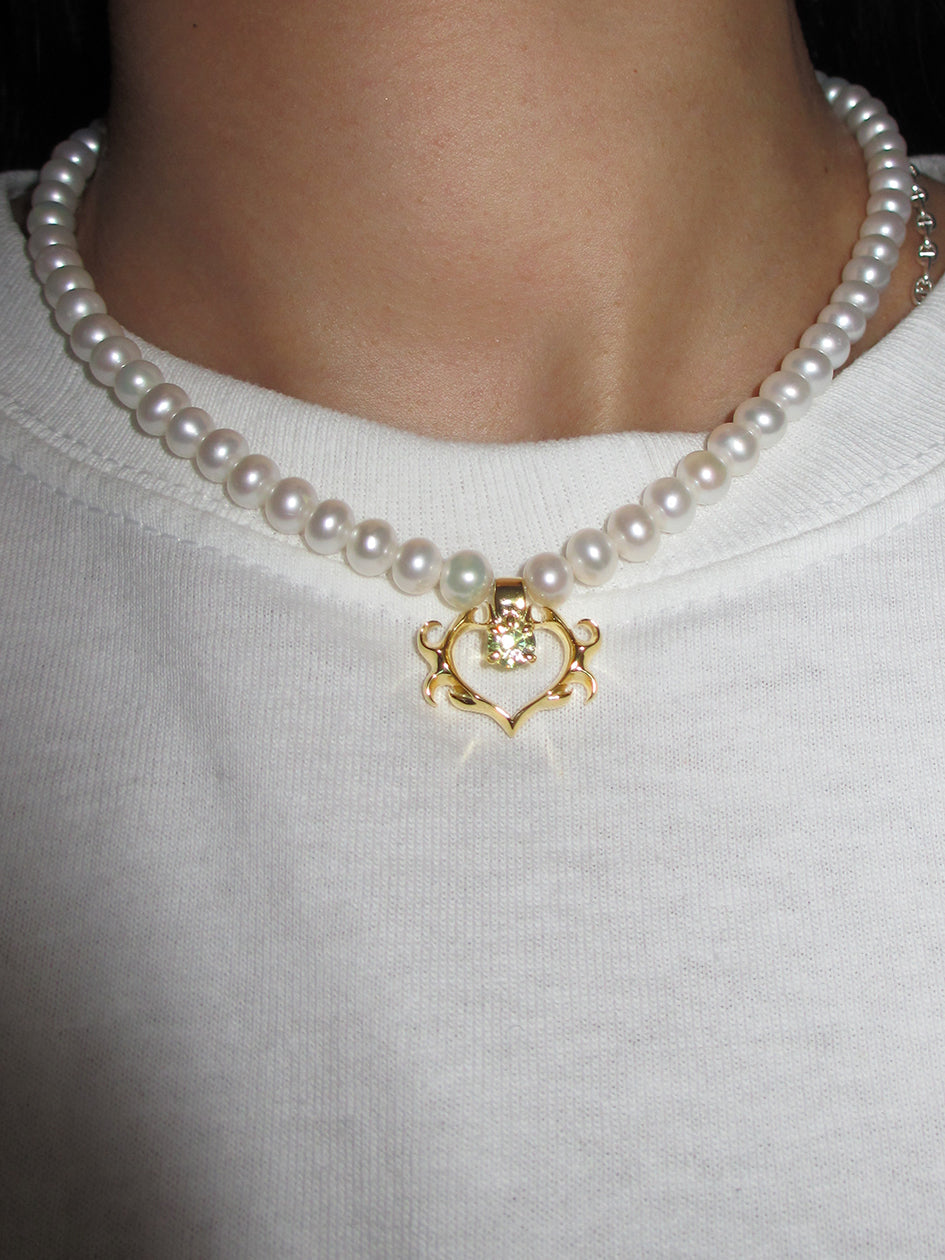 THE MINI SELMA HEART PEARL CHOKER features a miniature version of the original SELMA HEART pendant. Crafted from 925 sterling silver with a green cubic zirconia on white freshwater pearls, this one-of-a-kind piece is a timeless piece you'll have forever.