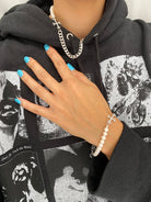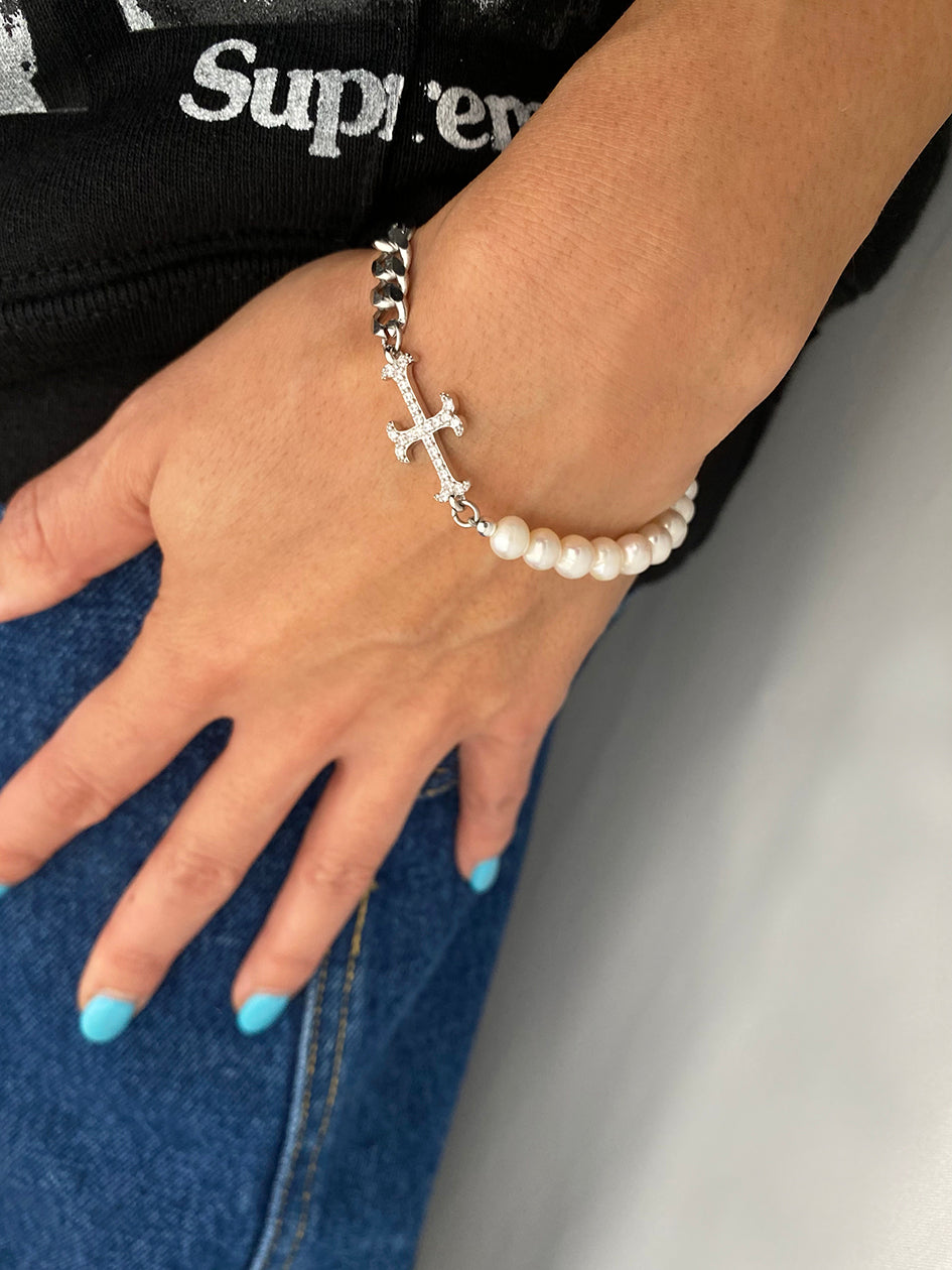 THE ADAMAS PEARL CHAN BRACELET combines white freshwater pearls with a stainless steel chain for an edgy yet elegant finish. Wear this piece solo or layered!