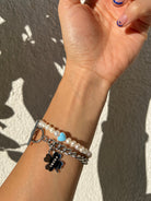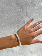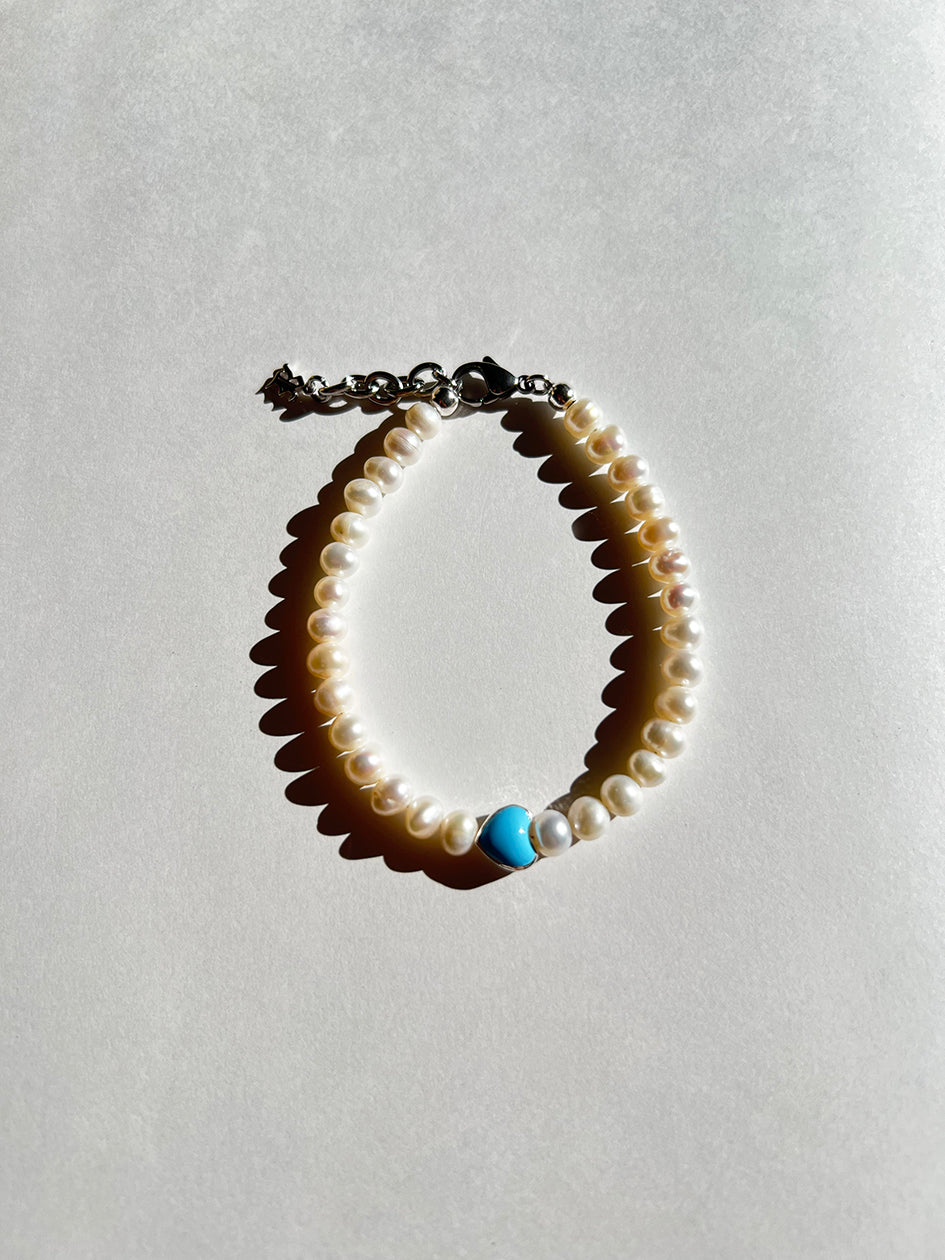 THE BABY BLUE HEART PEARL BRACELET is handmade with small 5mm size freshwater pearls, adorned with a baby blue sterling silver heart bead. The tiny pearl size makes this piece ultimate for layering. Pair it with one of our chains!