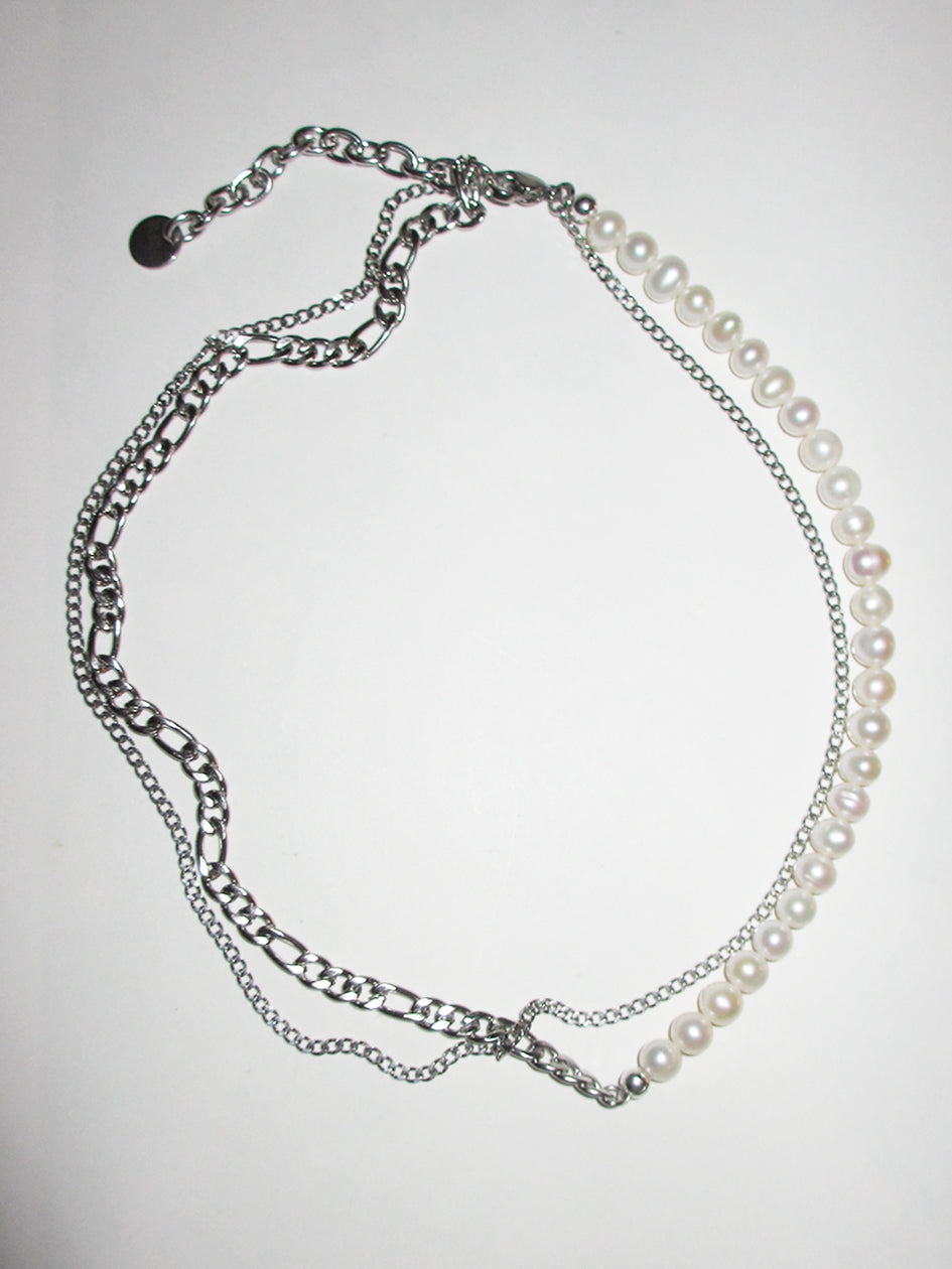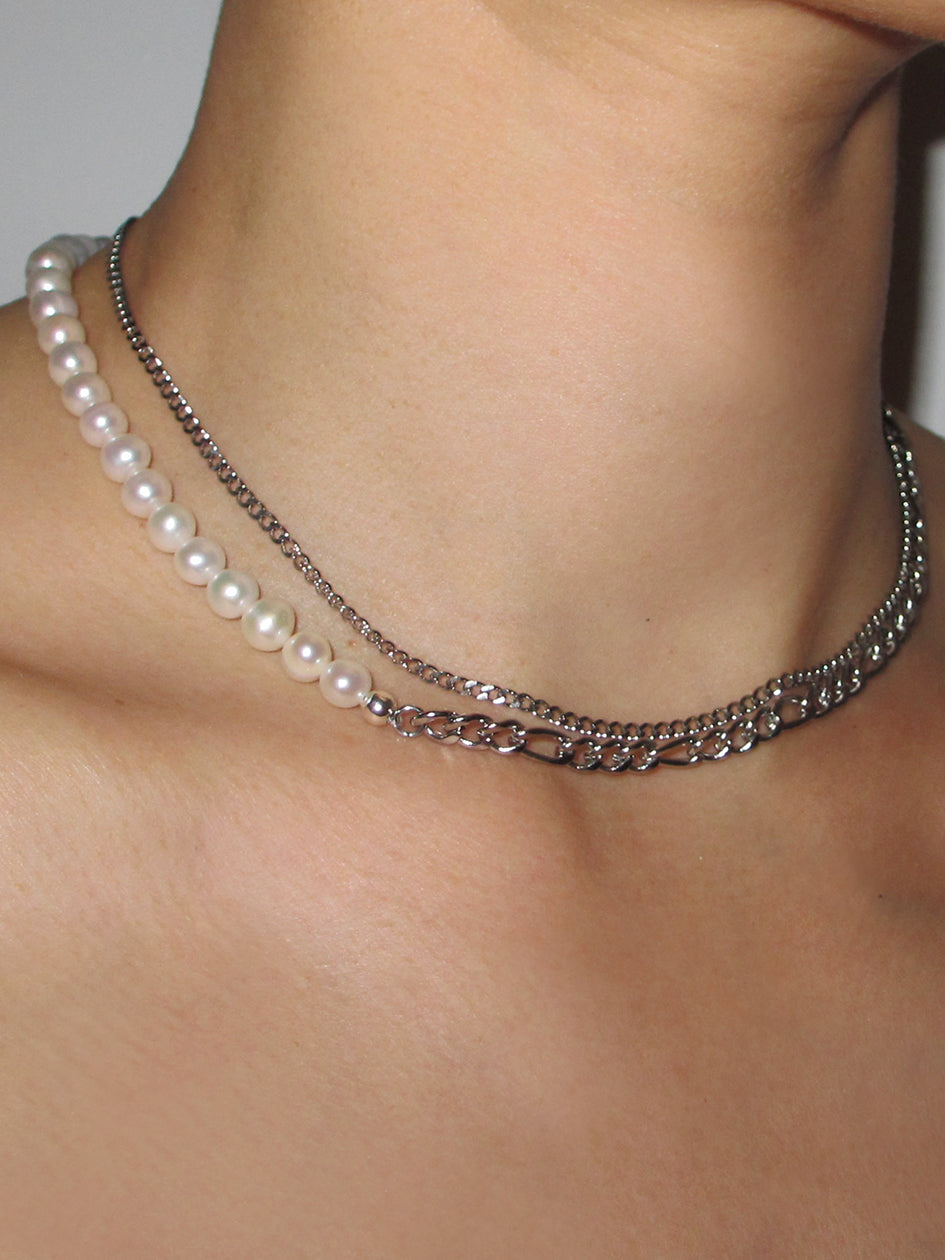 THE DUPLUS FRESHWATER PEARL FIGARO CHOKER combines white freshwater pearls with a stainless steel figaro chain and delicate curb chain. This everyday essential instantly creates a layered look!