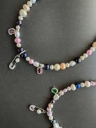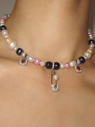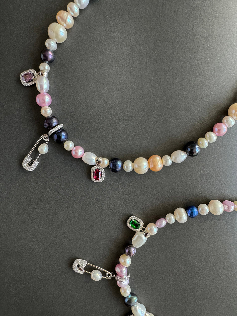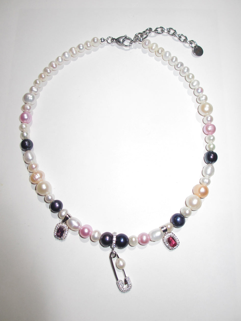 This unique piece combines our PIN THROUGH MY PEARL pendant with purple and red cubic zirconia charms, on a strand of stunning white, black, pink and peach freshwater pearls. Wear this one-of-a-kind piece to add personality to your look!