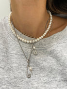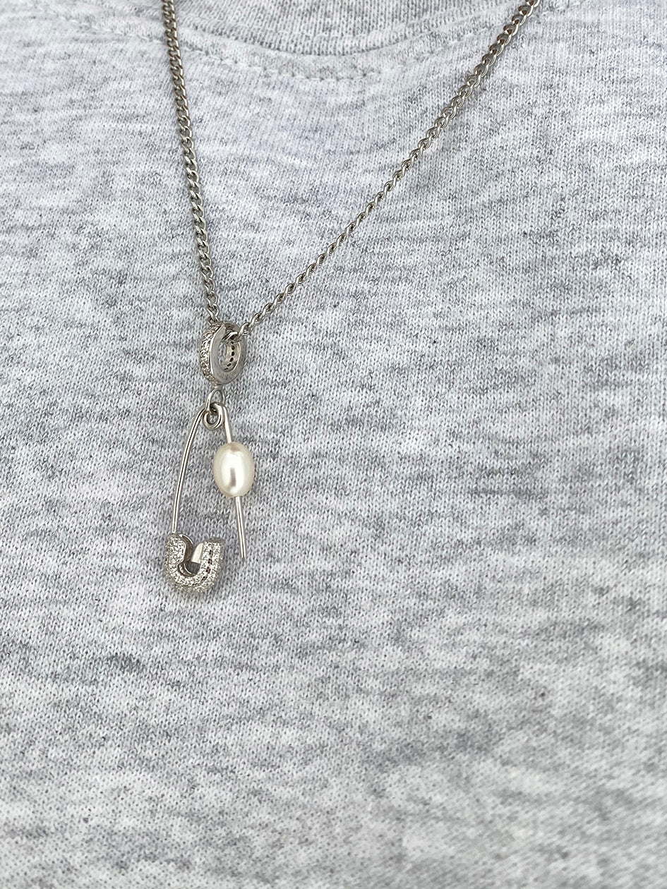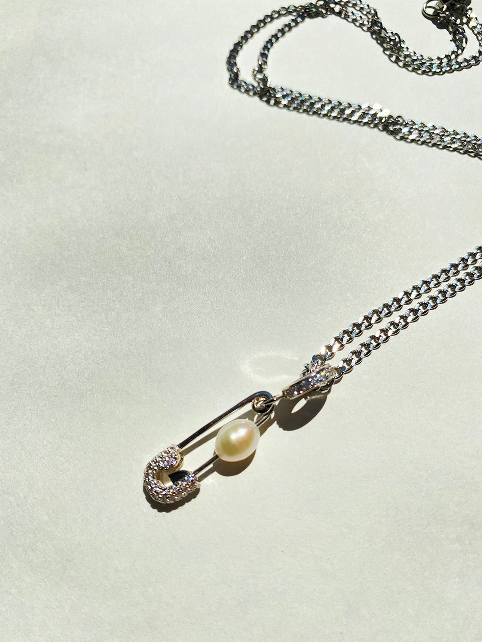 With THE PIN THROUGH MY PEARL CHAIN we kept playing with combining contemporary and classic elements, and added a genuine freshwater pearl to the sterling silver safety pin charm. This piece is truly unique yet perfect for everyday wear. Styled here with the PIN THROUGH MY PEARL FRESHWATER PEARL CHOKER