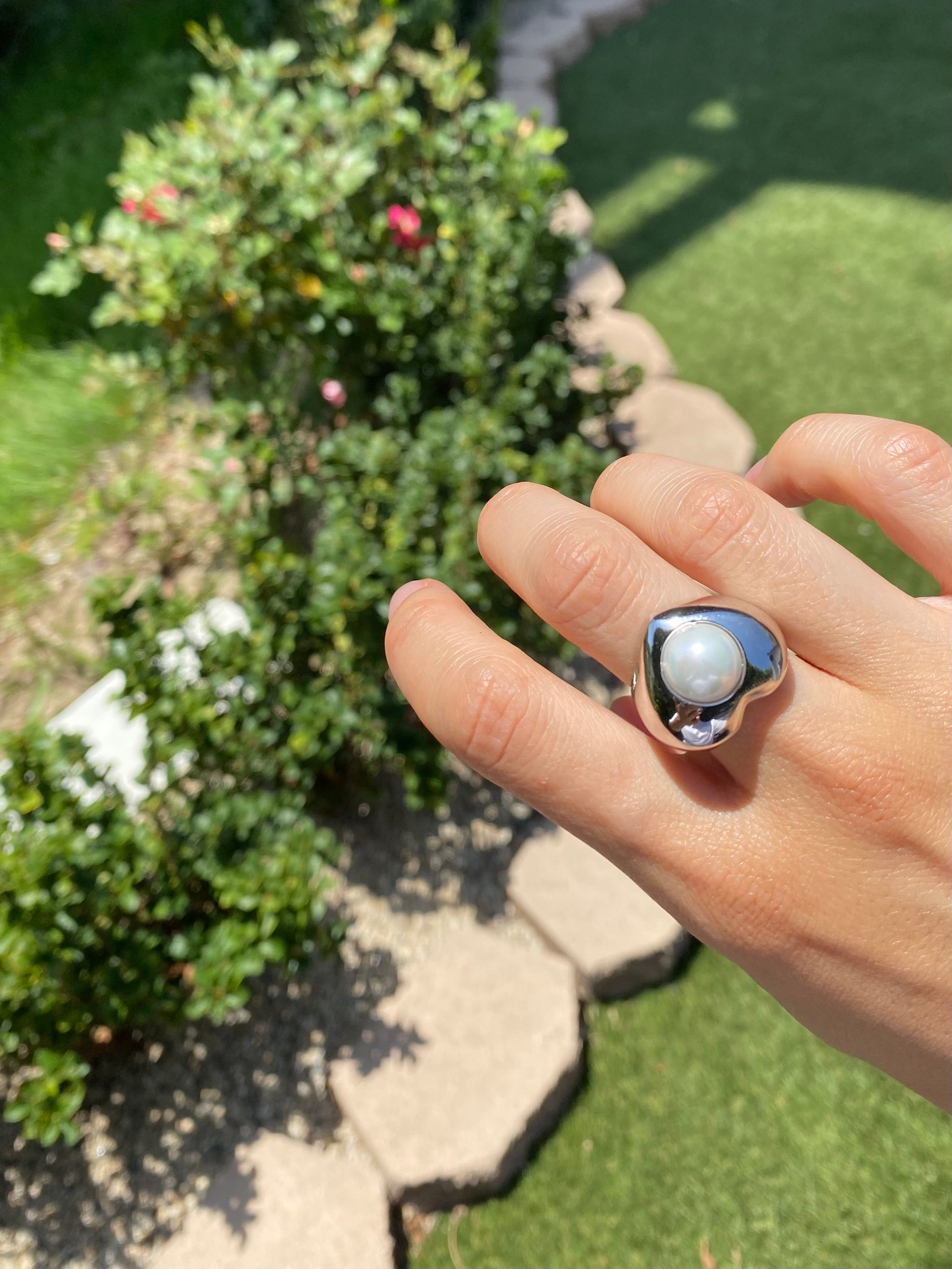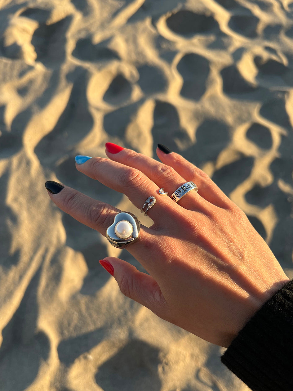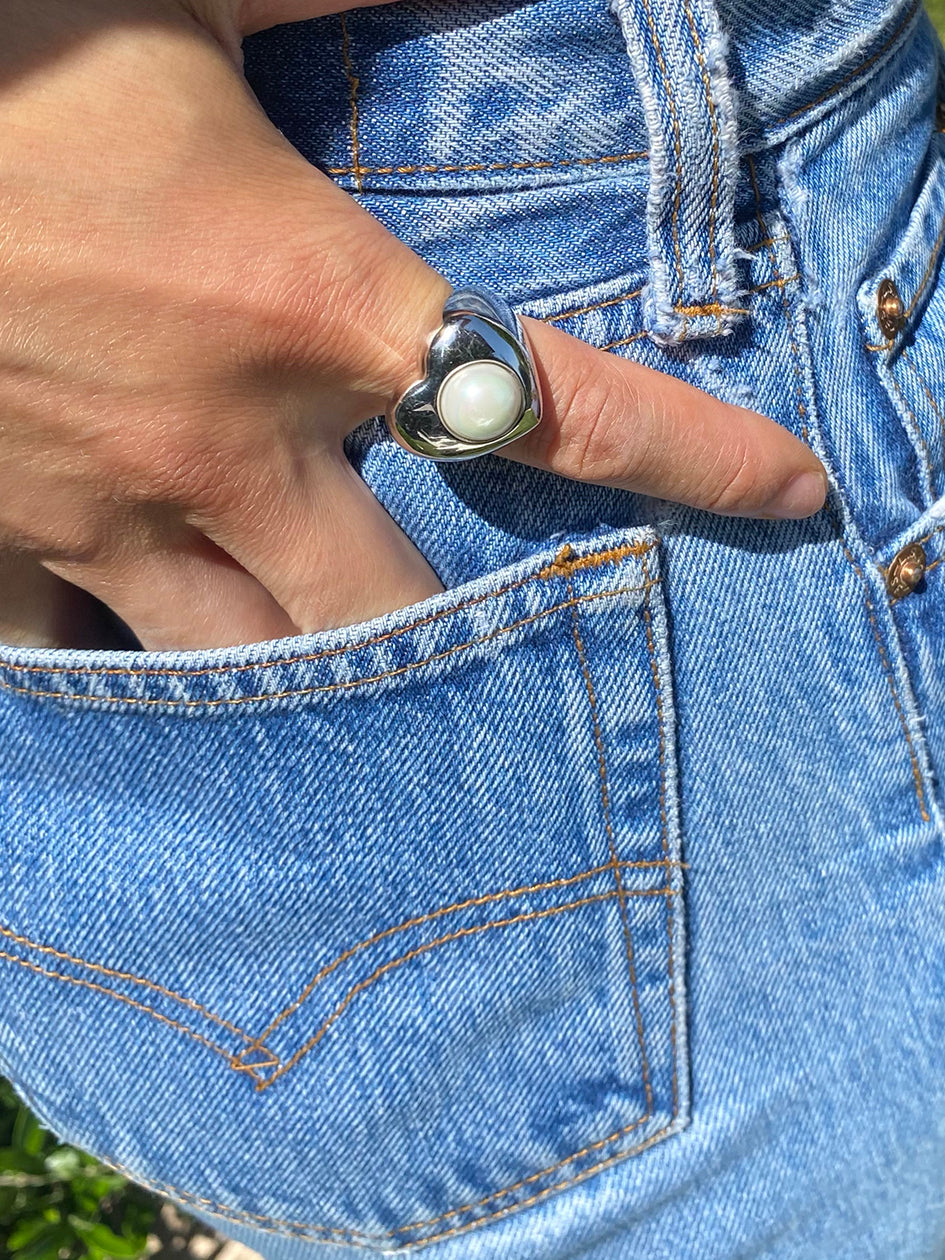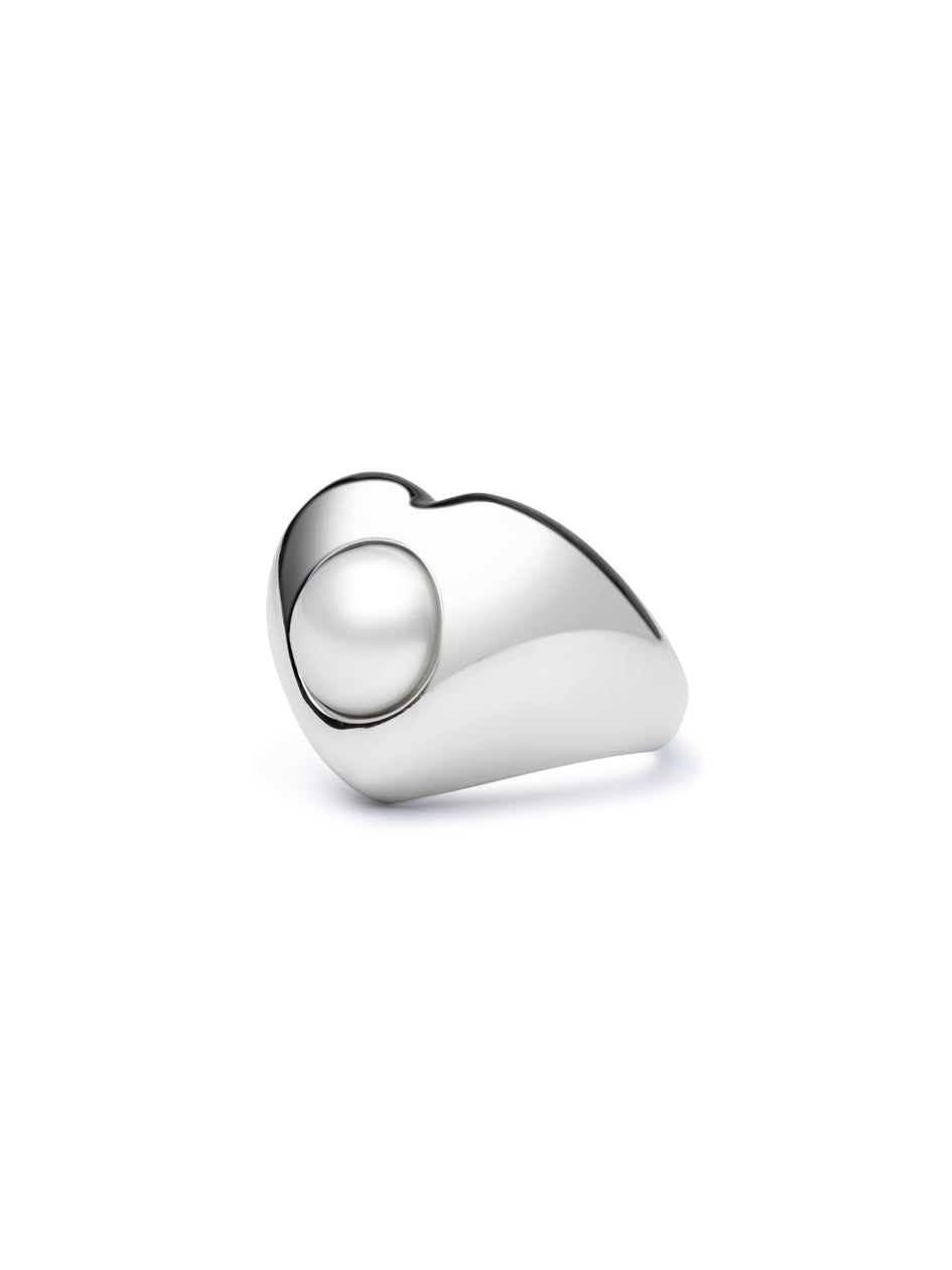 We had to make a ring to go with our VENUS HEART CHAIN. THE VENUS HEART RING is made from 925 sterling silver, adorned with a white shell pearl. It's perfectly chunky and looks as good on its own as it does paired with other rings. Wear it day and night!