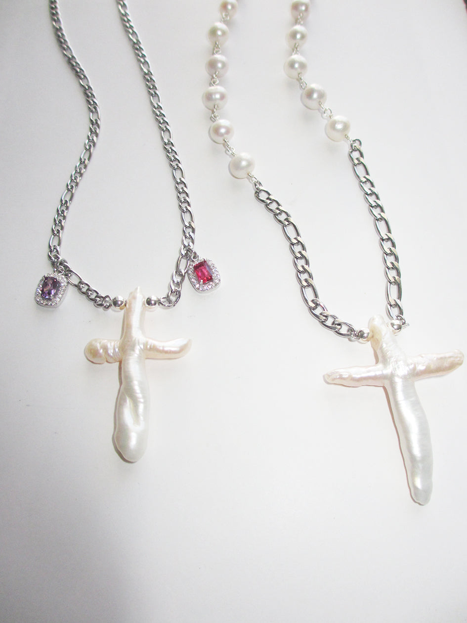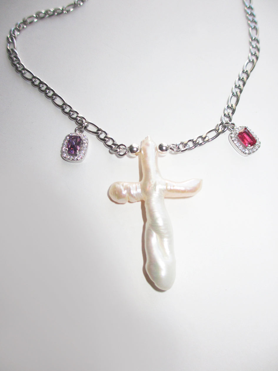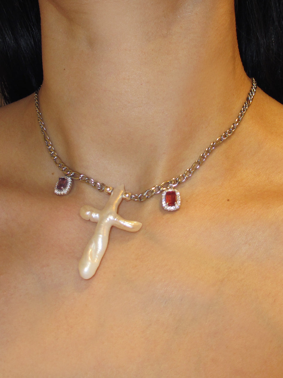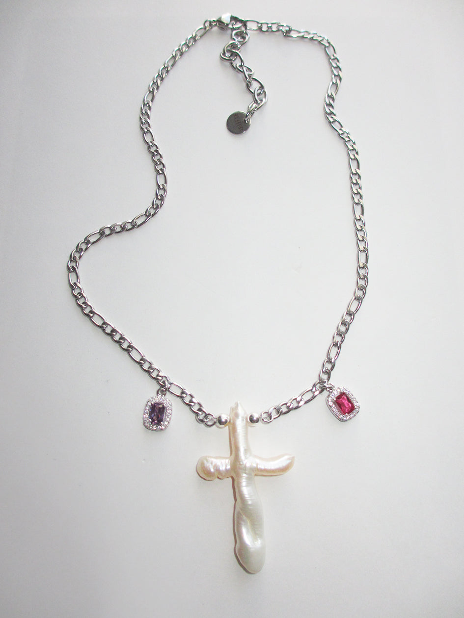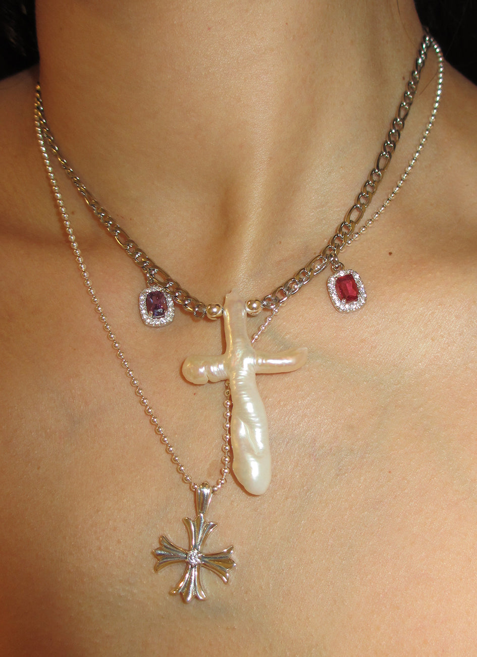 THE GEMMA CROSS FIGARO CHAIN 2.0 is an updated version of our OG GEMMA CROSS FIGARO CHAIN. Featuring a large pearl cross and 925 sterling charms with purple and red stones on a stainless steel figaro chain. This piece looks as good on its own as it does layered.