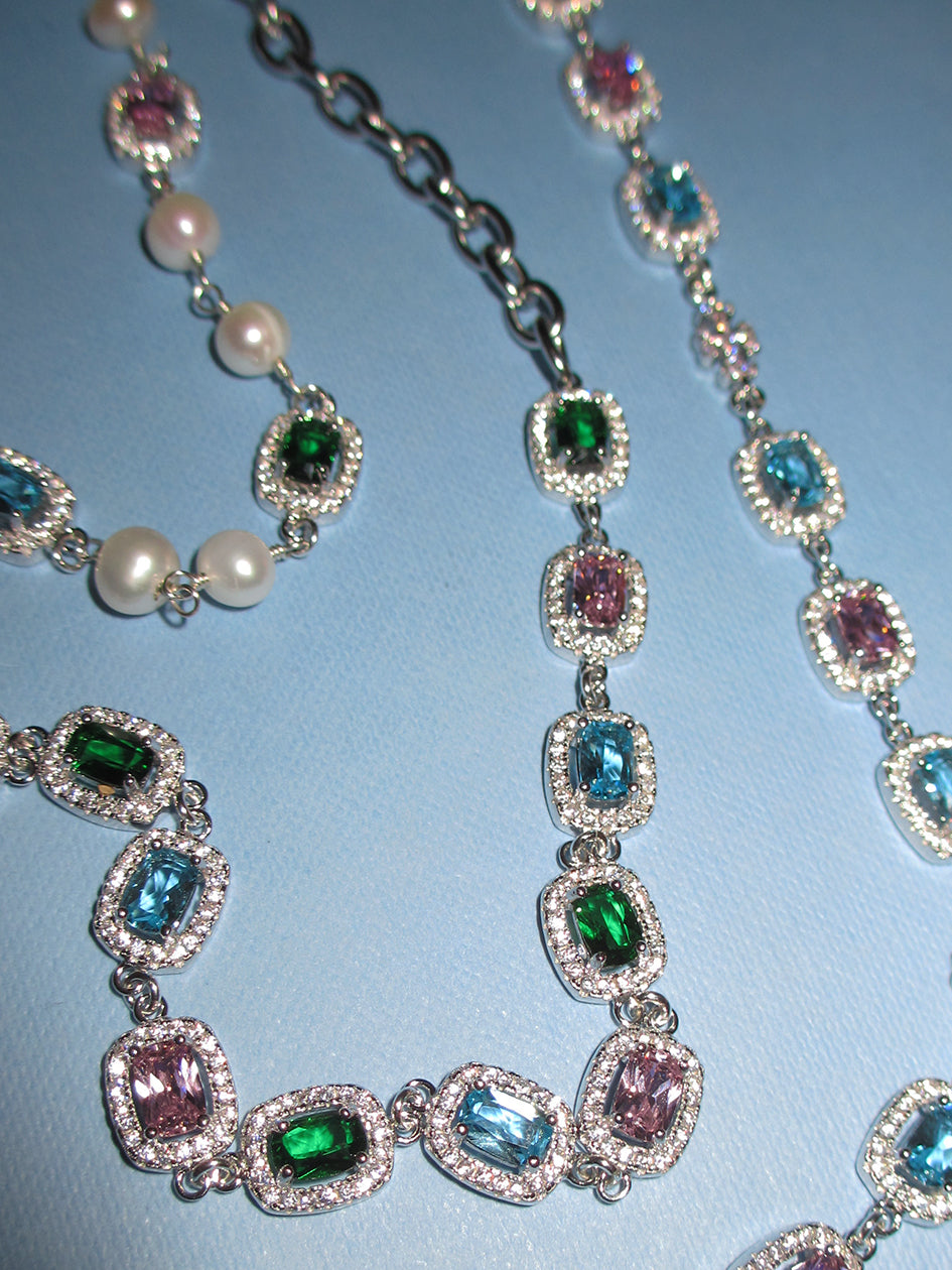 THE MULTI GEM CHOKER features stunning pink, green, and light blue gem charms in 925 sterling silver. Pair it with the matching MULTI GEM BRACELET for a complete look.