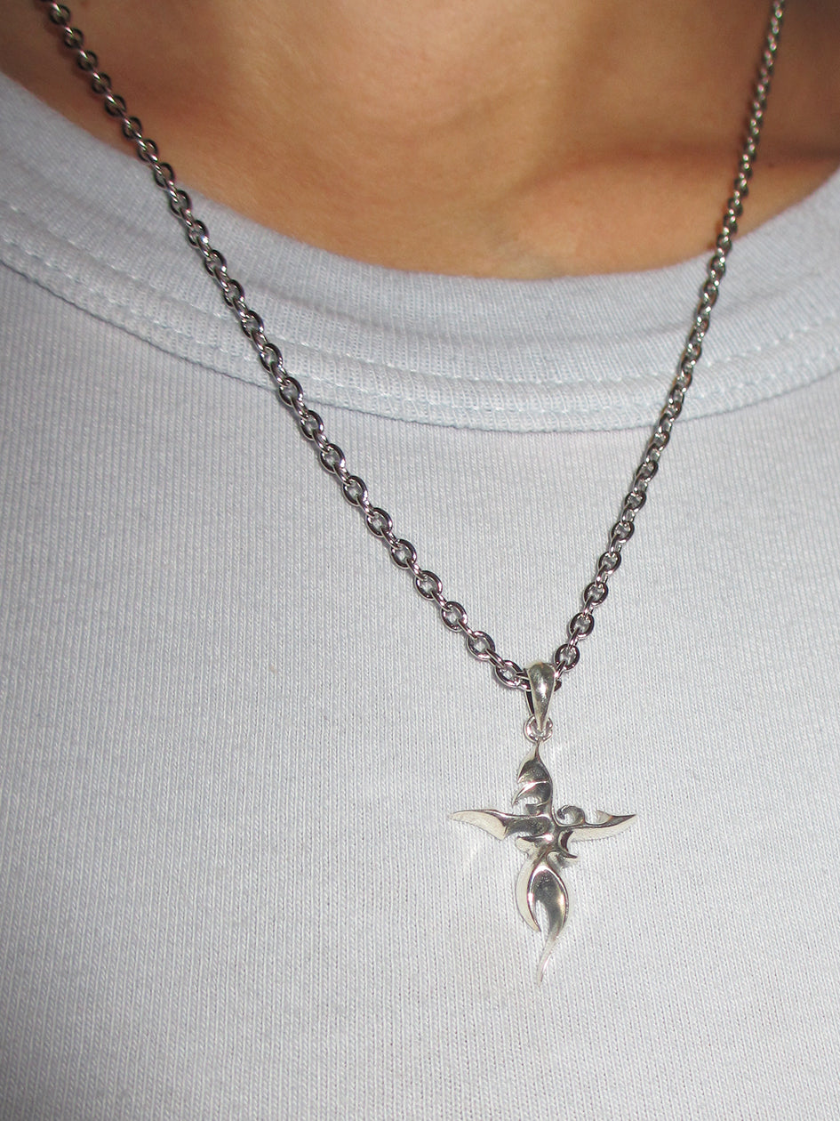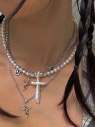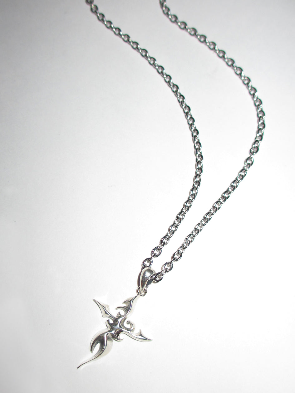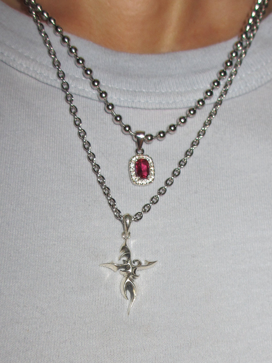THE SELMA CROSS CHAIN features a tribal cross charm in 925 sterling silver on a stainless steel chain. This piece is the perfect everyday necklace and looks as good on its own as it does layered. Styled with the RED GEM BALL CHAIN