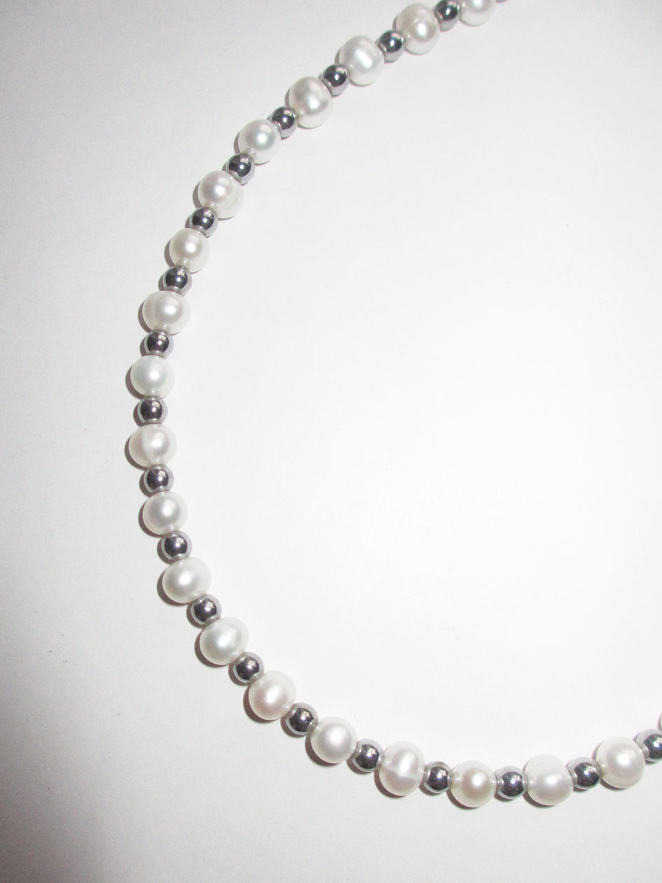 THE HEMATITE FRESHWATER PEARL CHOKER combines genuine freshwater pearls with hematite, a natural gemstone believed to bring mental clarity, protect against negativity and provide balance for its wearer.