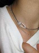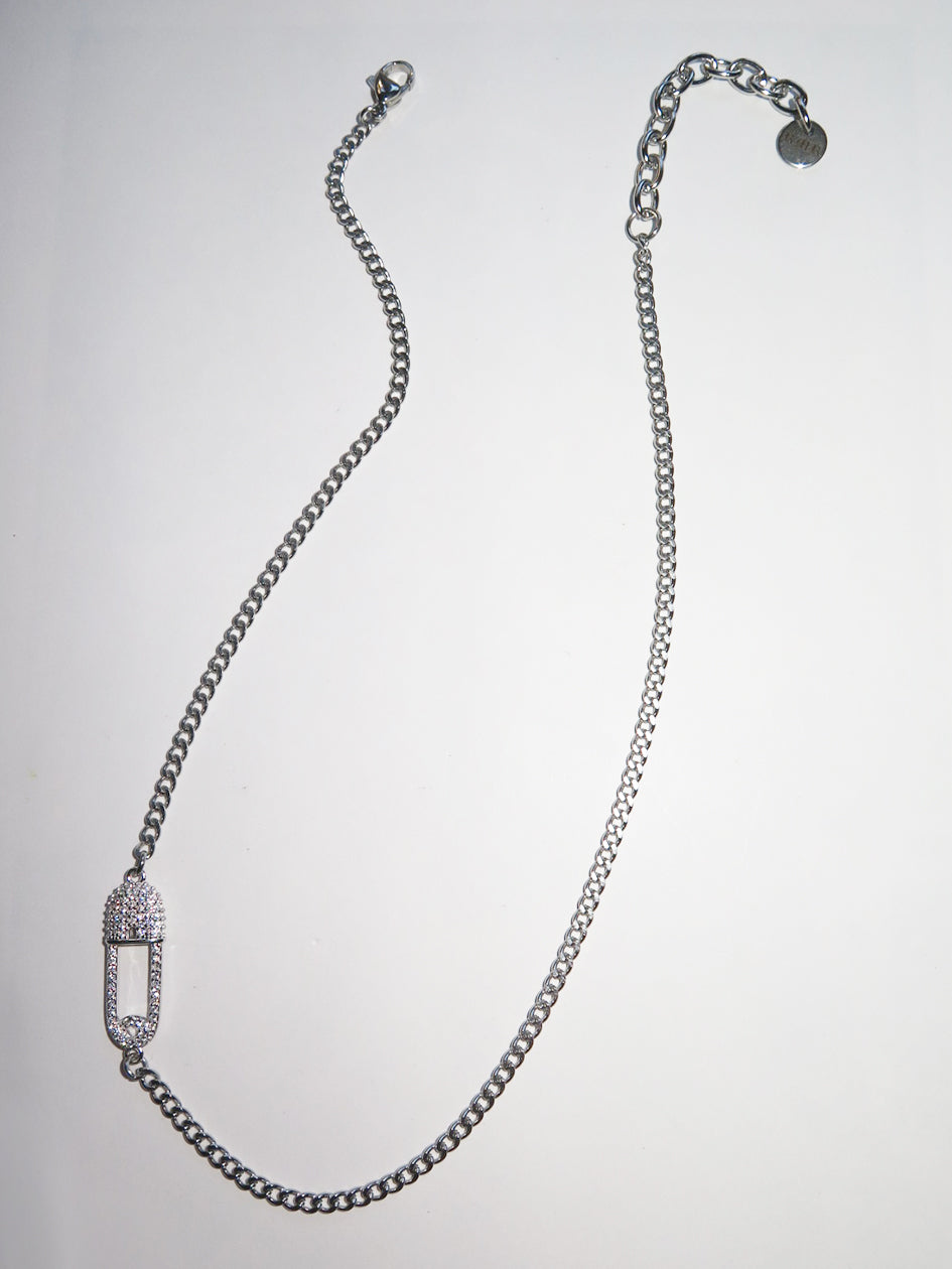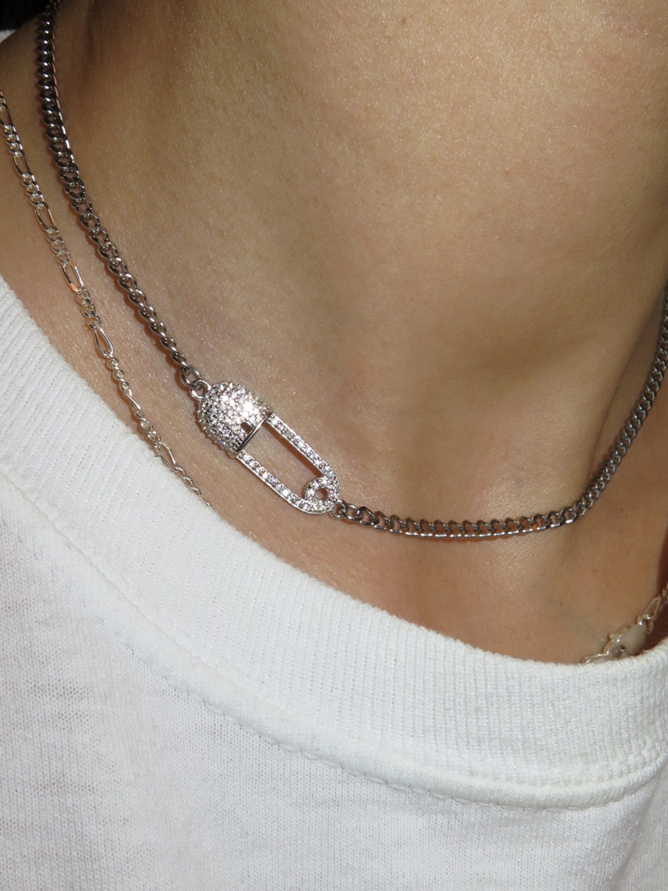 An edgy yet luxurious touch, THE ICED SAFETY PIN CHAIN features a CZ diamond covered safety pin that falls on the side of your neck. Wear this gem layered or solo.