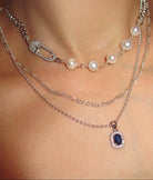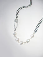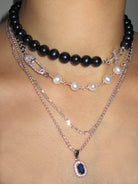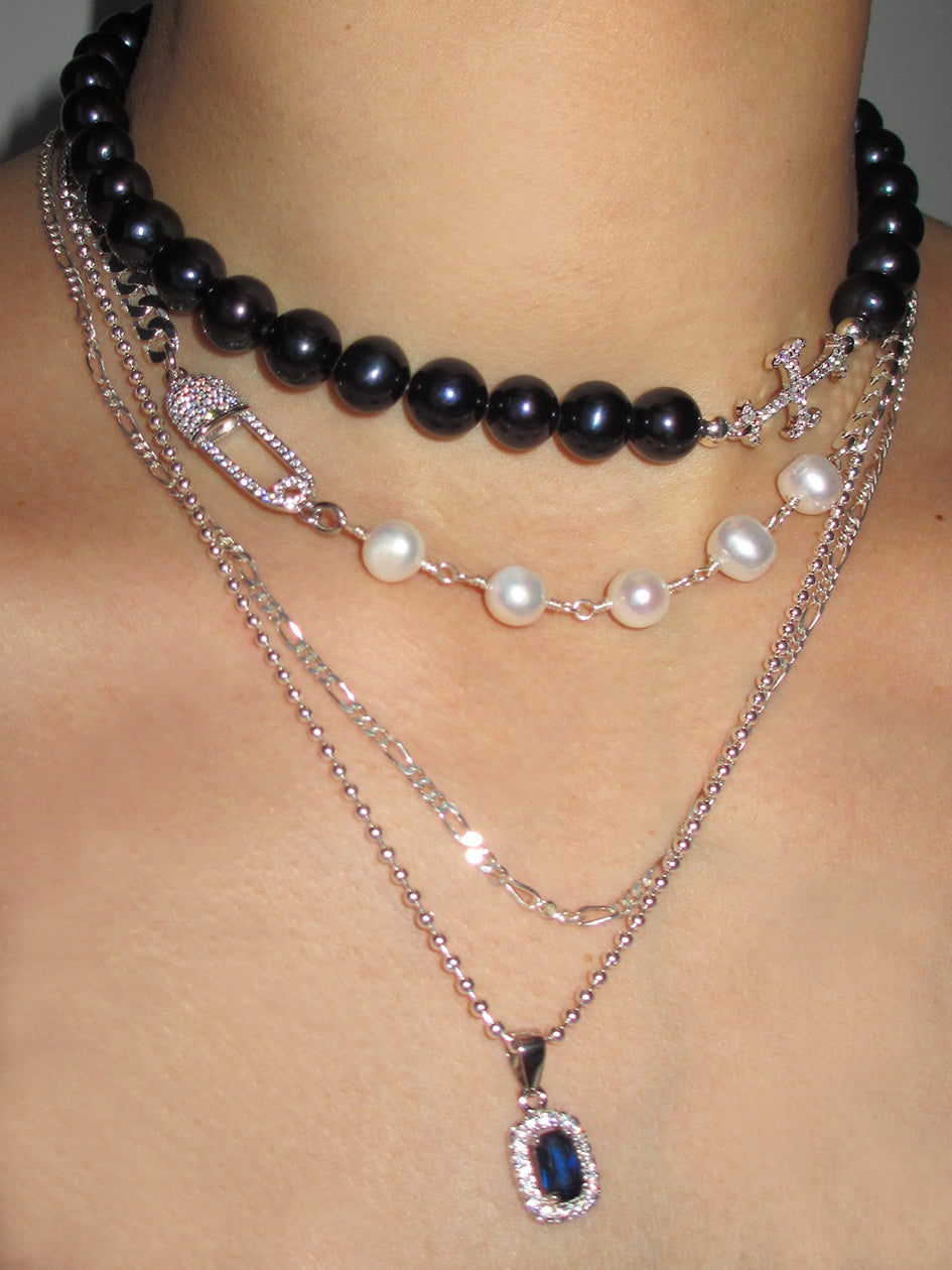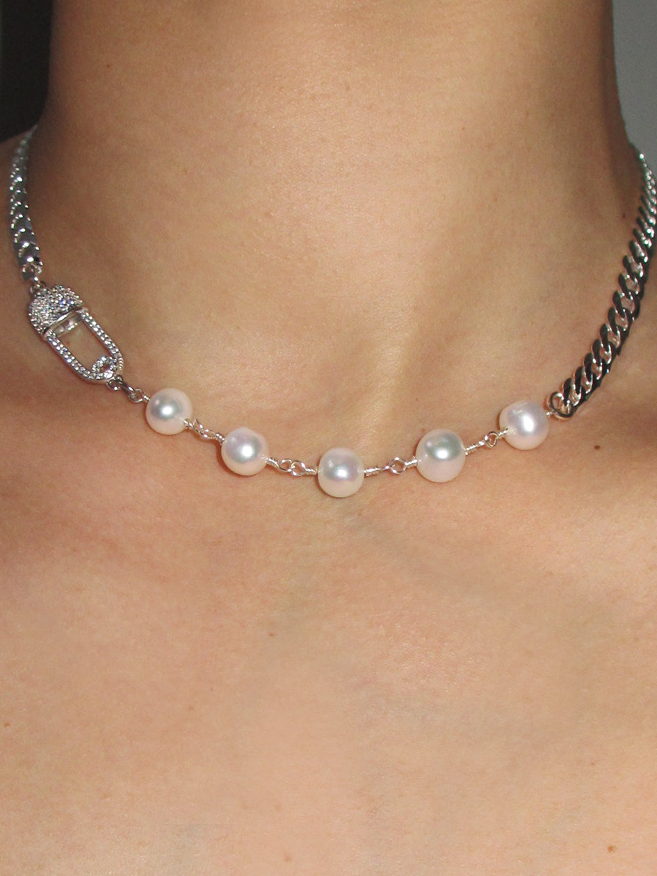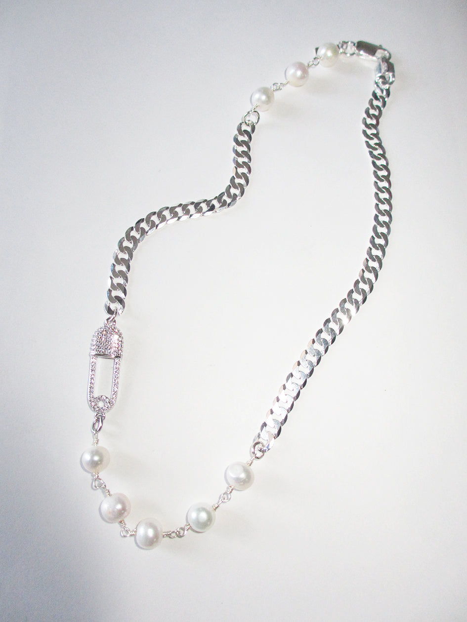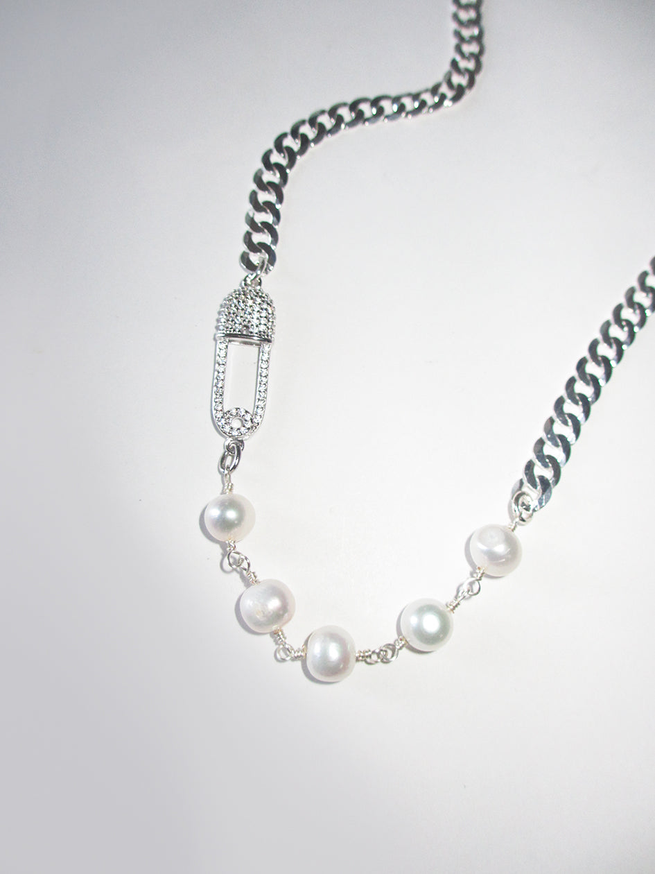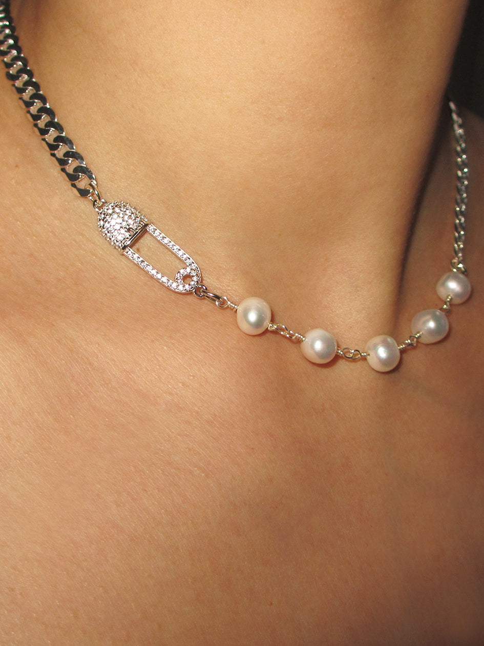 THE SAFETY PIN ROSARY CHAIN CHOKER features a CZ covered 925 sterling silver safety pin charm and 925 sterling silver curb chain, combined with stunning freshwater pearls. Crafted by hand with meticulous attention to detail, this piece will add uniqueness to all your looks!