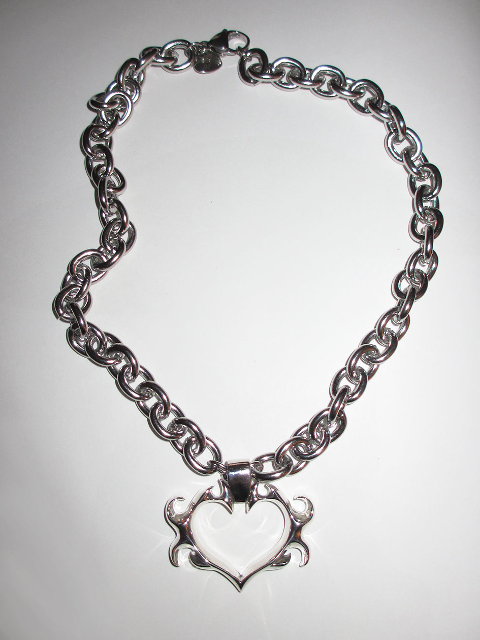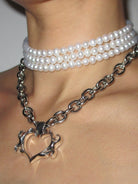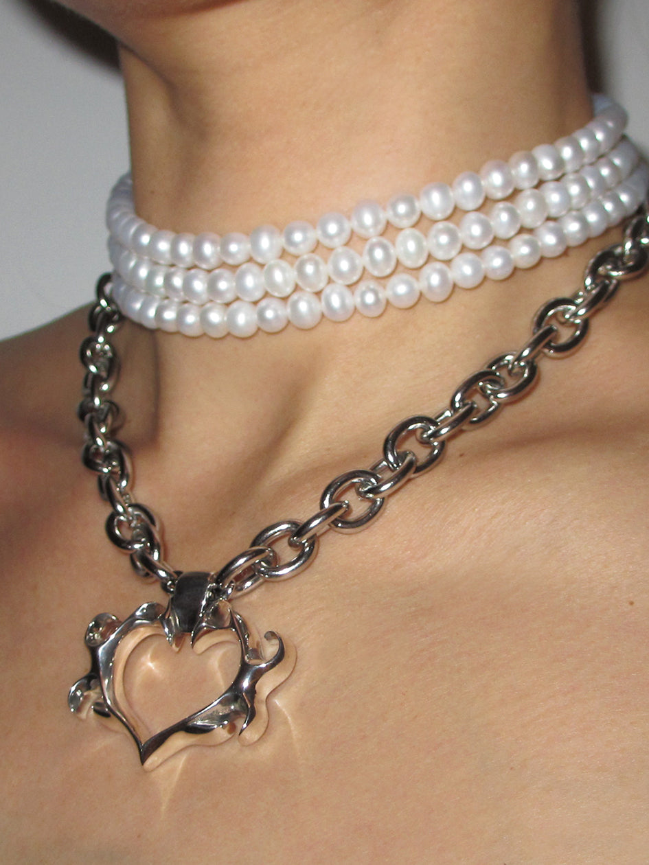 THE XL SELMA HEART CHAIN CHOKER features a large, weighty solid 925 sterling silver heart pendant on a stainless steel chain. This one-of-a-kind piece will complete all your looks! Paired here with our 3 ROW FRESHWATER PEARL CHOKER