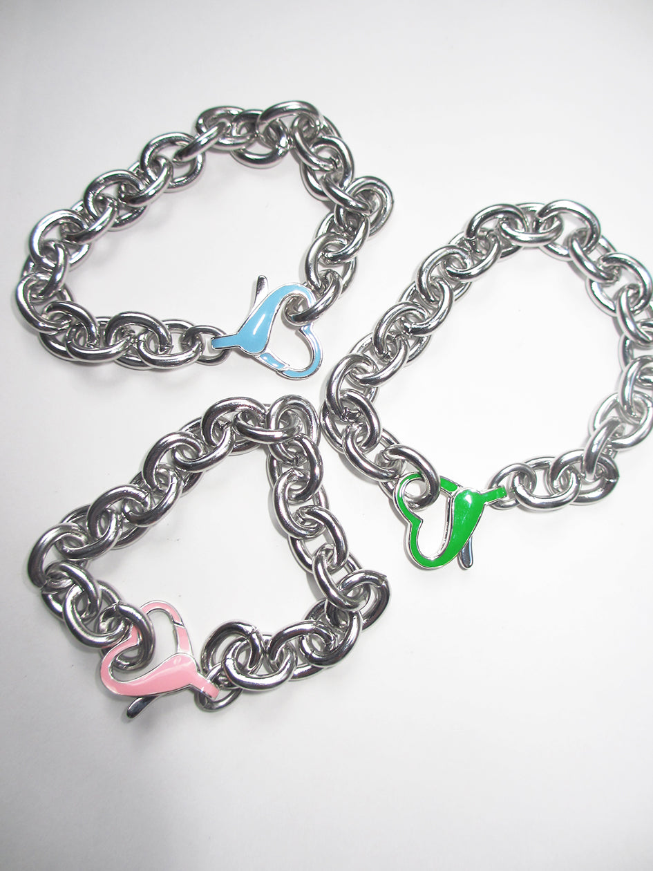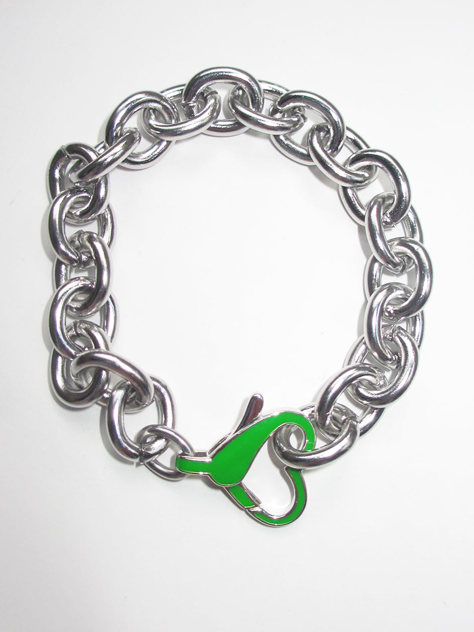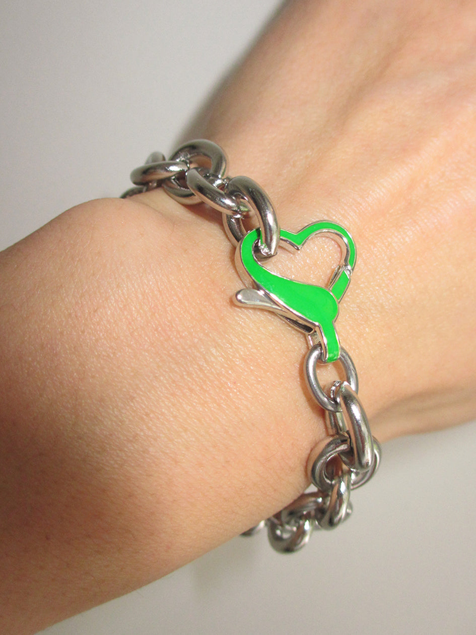 THE GREEN HEART CLASP BRACELET features an adorable heart clasp in 925 sterling silver with green enamel on a rolo stainless steel chain. This piece will add a unique touch to all your looks!