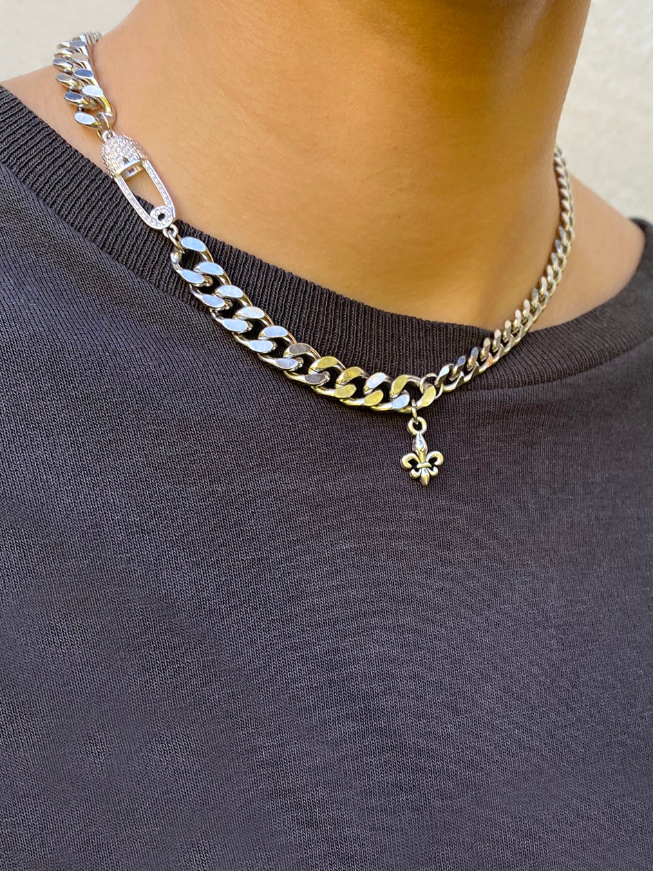 THE DIMIDIUM CHAIN CHOKER SILVER features an iced out safety pin charm on a stainless steel chain. It's the perfect everyday piece with a unique touch. Wear it solo or layered!